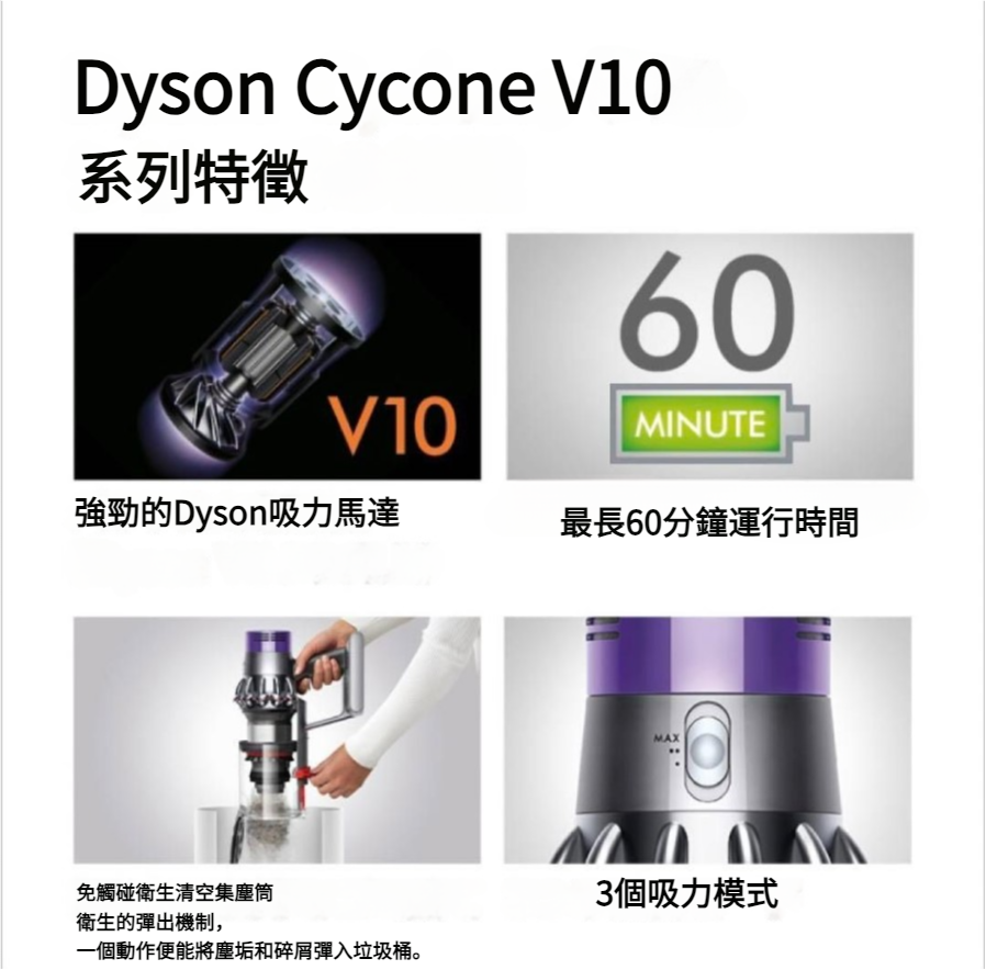 - 由DysonV10數碼摩打驅動 - 強勁吸力清除隱藏塵垢,持久無衰減吸力助你深入清潔家居每個角落。