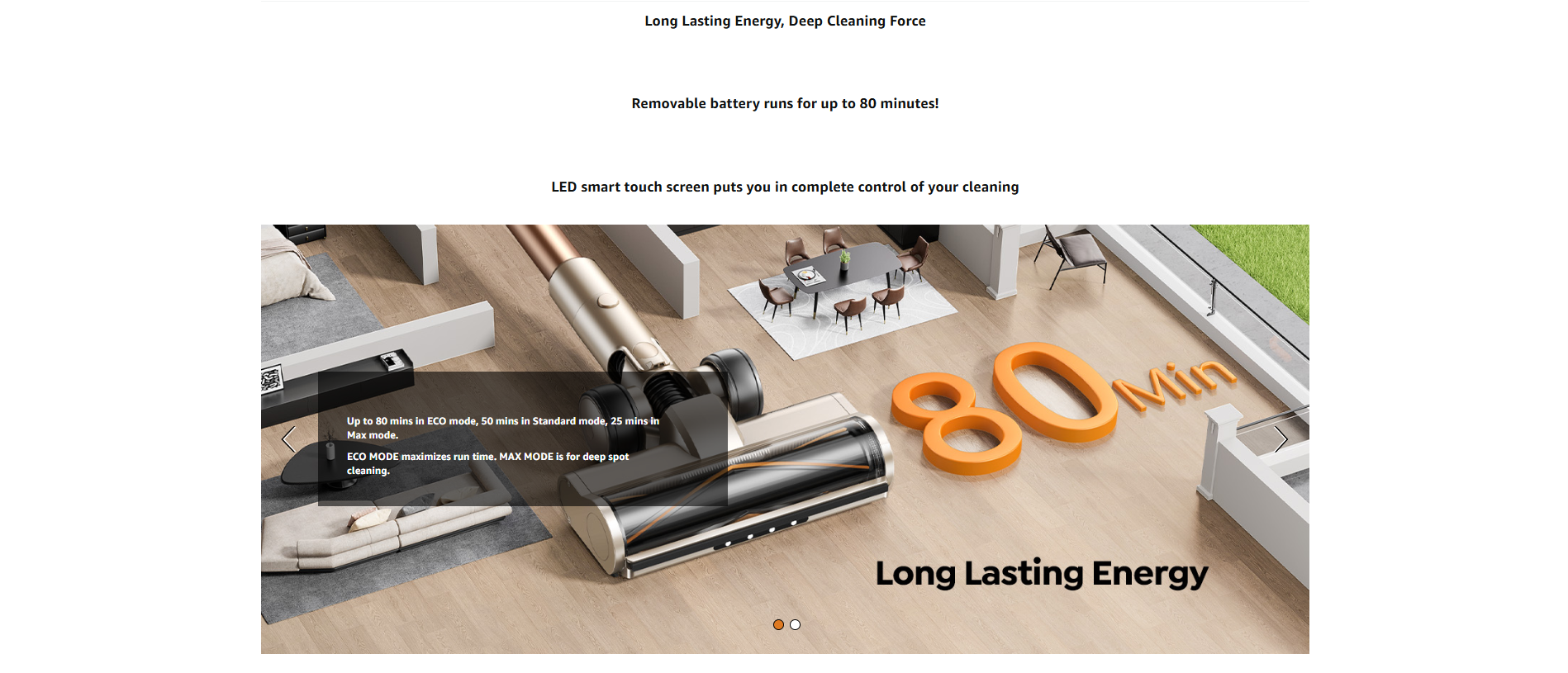 長達 80 分鐘的運行時間: 結合深層清潔吸力與無線便利性,確保有充足的時間進行深度清潔。ECO 模式可最大化運行時間,MAX 模式則用於深層清潔。