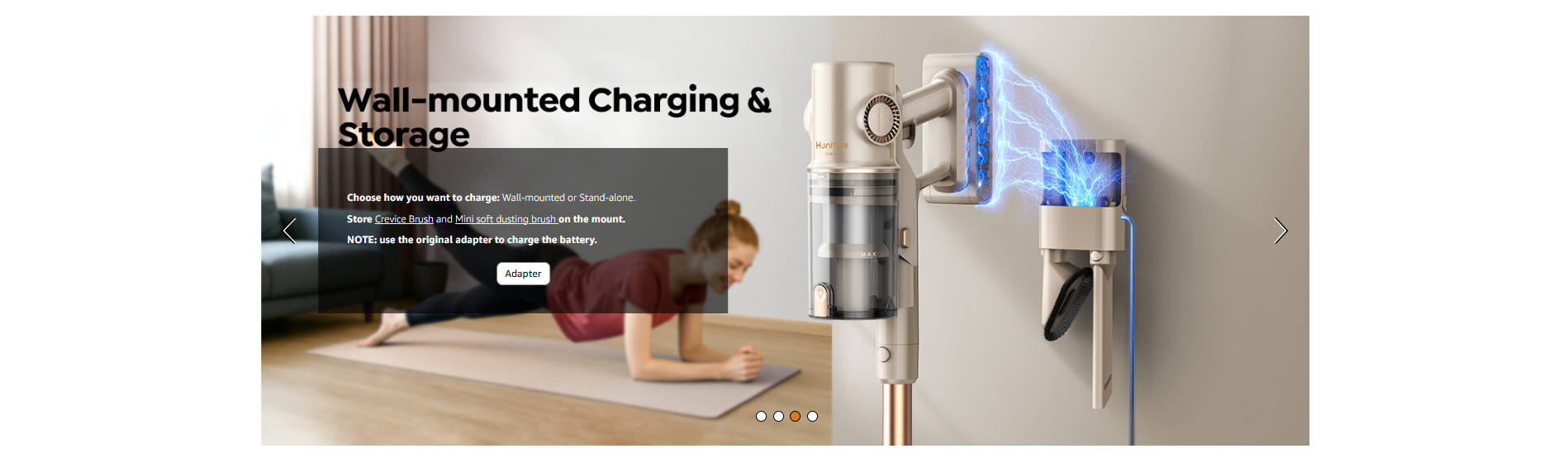 易於充電和存放: 吸塵器可掉落到壁掛式底座中進行充電並整齊存放。配件包括 8 英吋(約 20.3 公分)隙縫工具和迷你軟除塵刷。