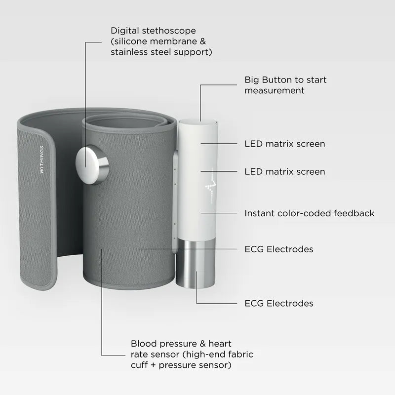 使用血壓監測儀的形式,用戶僅需90秒即可在設備上直接查看彩色反饋的報告,並通過Wi-Fi或藍牙連接在免費的 Withings 應用程式中查看完整的歷史記錄。數據可以輕鬆與醫生共享。